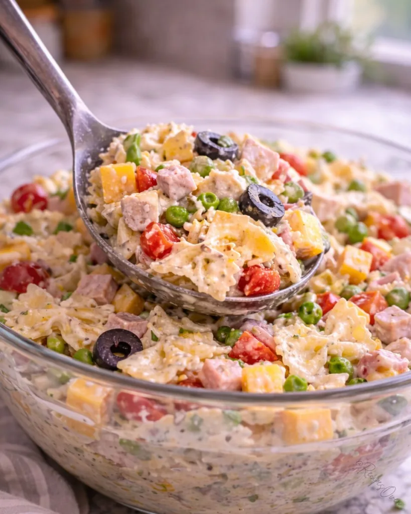 Keywords: bow tie pasta salad, creamy pasta salad, chicken ham pasta salad, potluck side dish